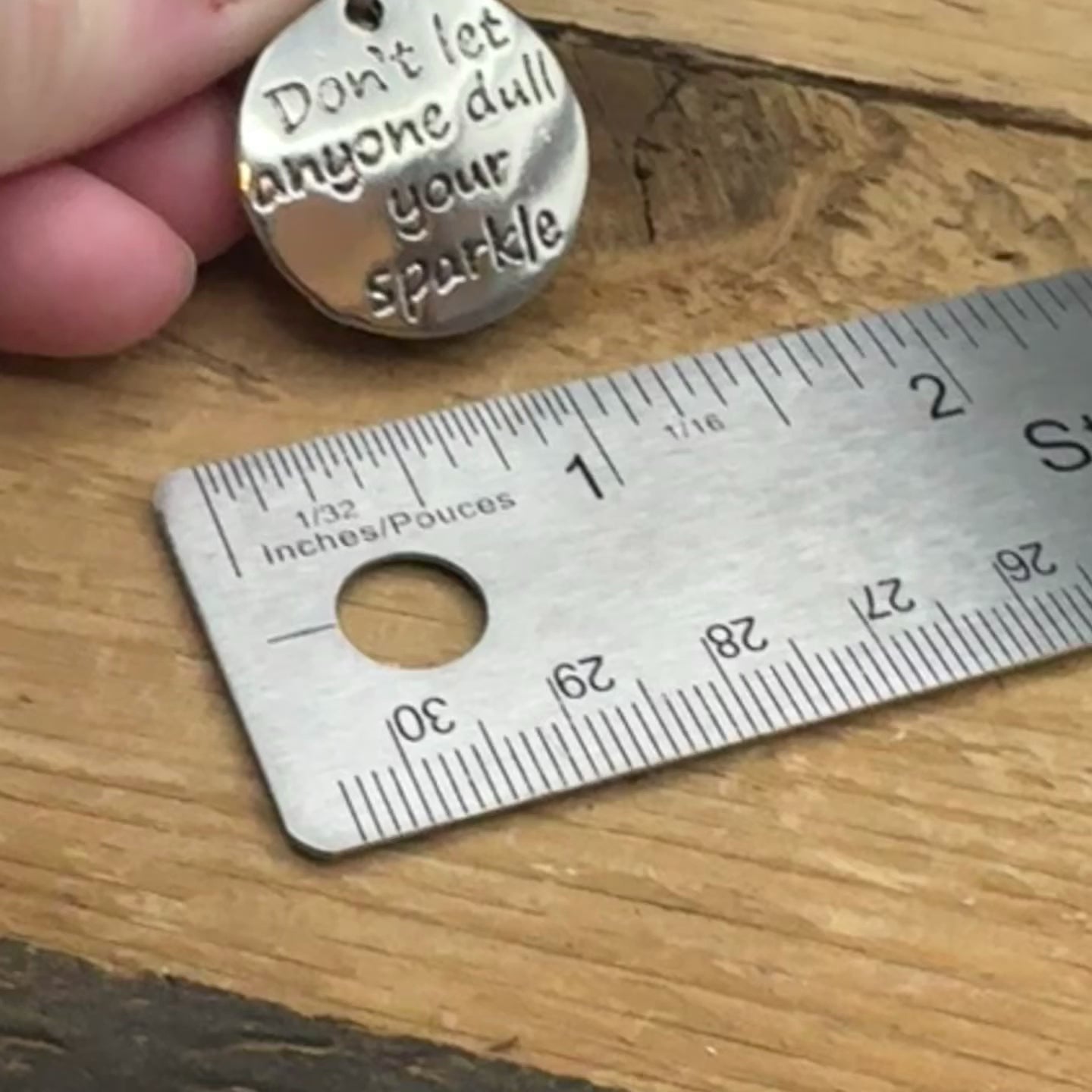The Keep Sparkling Charm is a 25mm round brushed silver-toned piece stamped with the playful reminder, “Don’t let anyone dull your sparkle” in casual, cheerful script. The quote appears on both sides, and it's rhodium plated for a durable, tarnish-resistant finish—perfect for adding a touch of encouragement and shine to any charm bar creation.