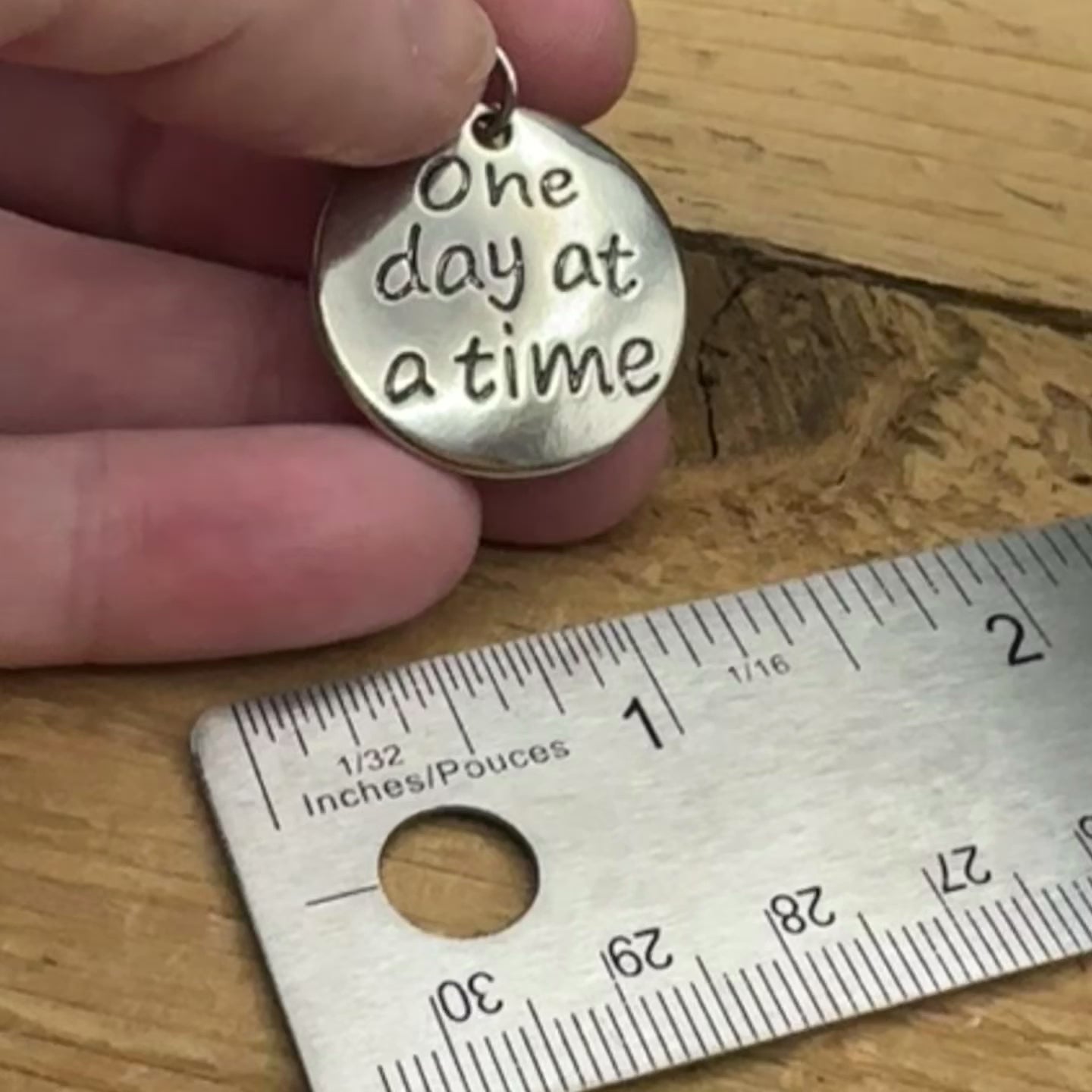 The "One Day at a Time" charm is a round, silver-toned disc measuring approximately 25mm with a softly domed surface and a comforting, tactile feel. The phrase is engraved in a playful, handwritten-style font and slightly darkened for contrast, appearing on both sides for added meaning. Rhodium plated for durability and shine, this charm is a thoughtful reminder to take life moment by moment.