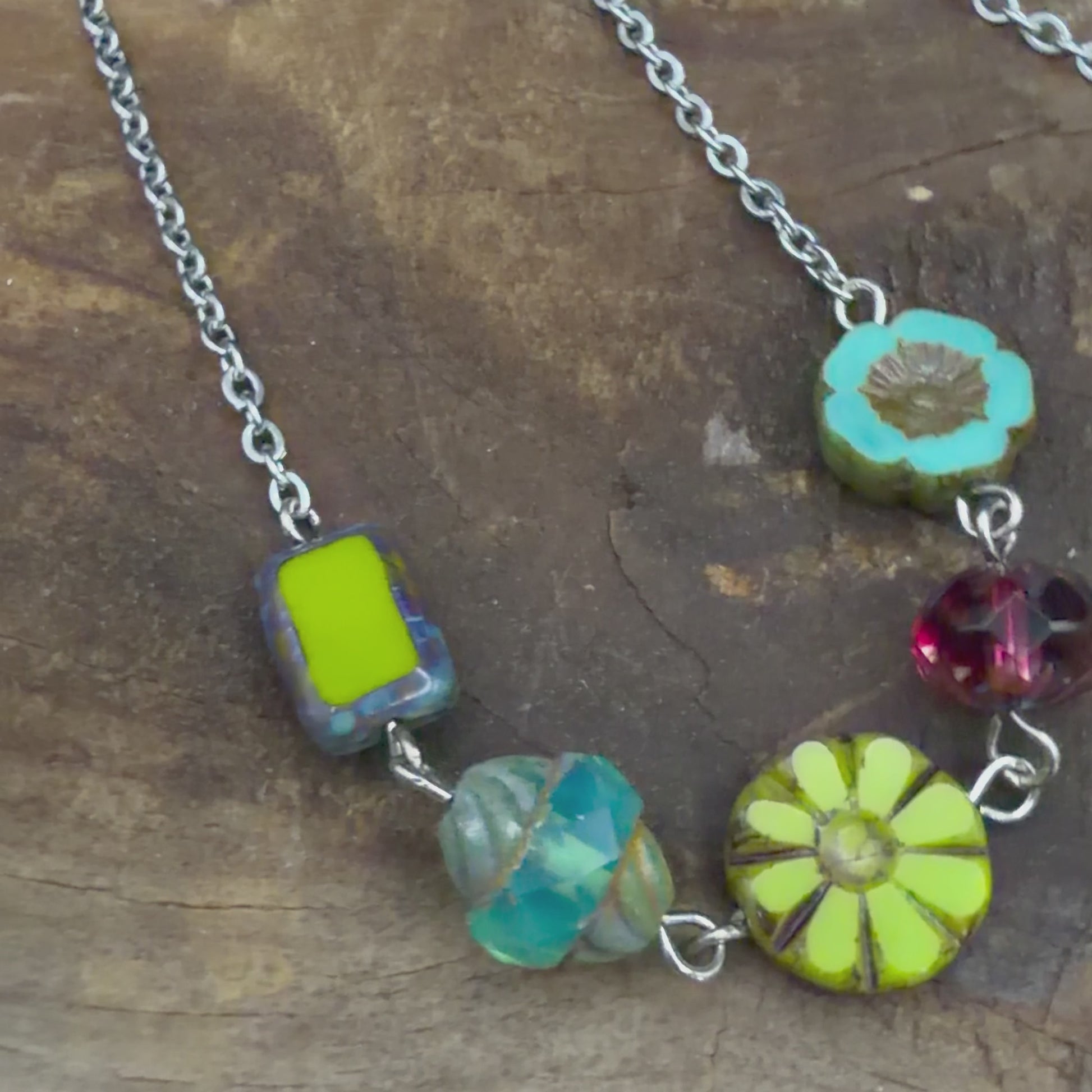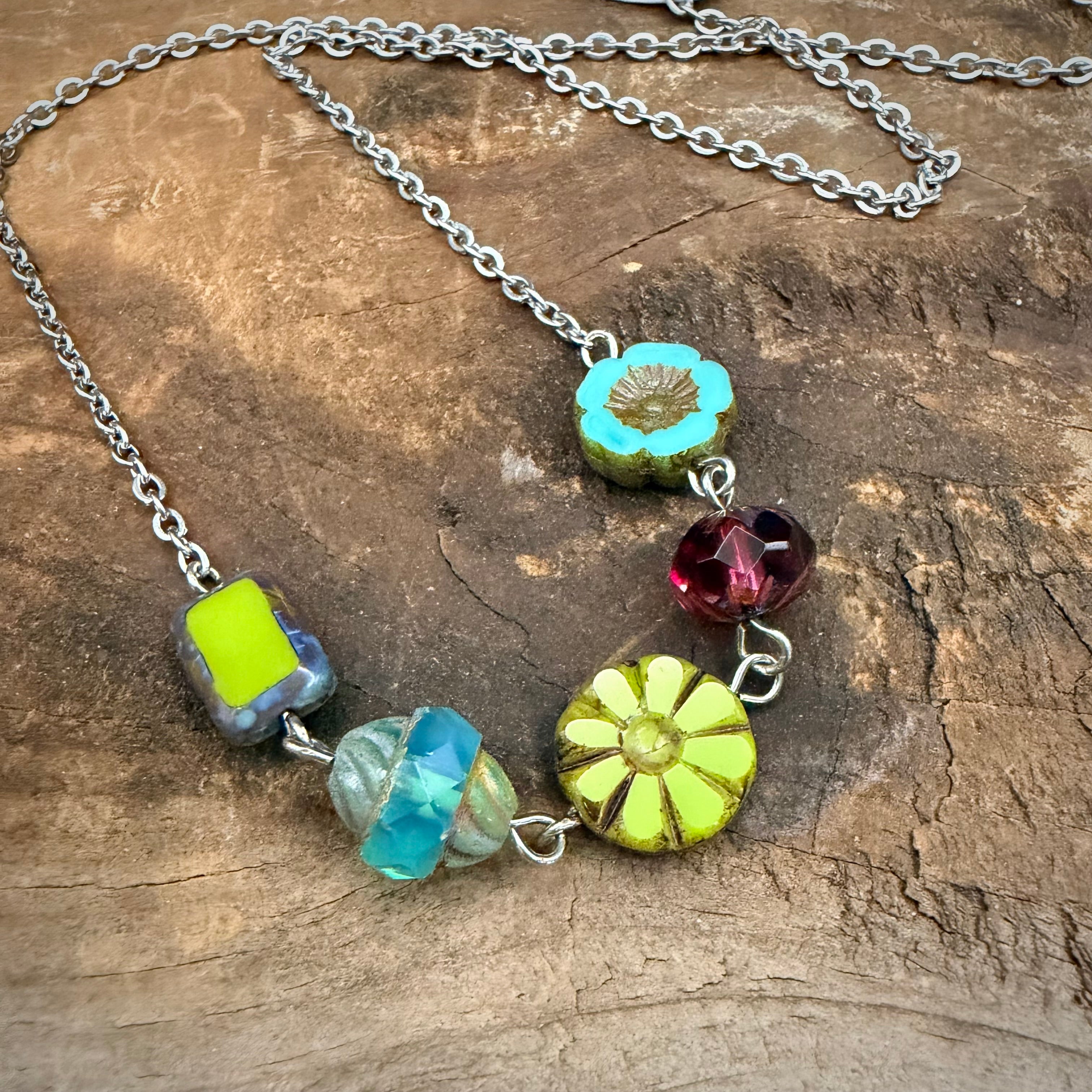 Inspired by the feeling of collecting small treasures from a summer garden, this necklace features a thoughtful mix of Czech glass beads in soft florals, faceted accents, and gentle pops of colour. Each bead brings its own shape and tone, coming together in a design that feels relaxed, organic, and beautifully imperfect.