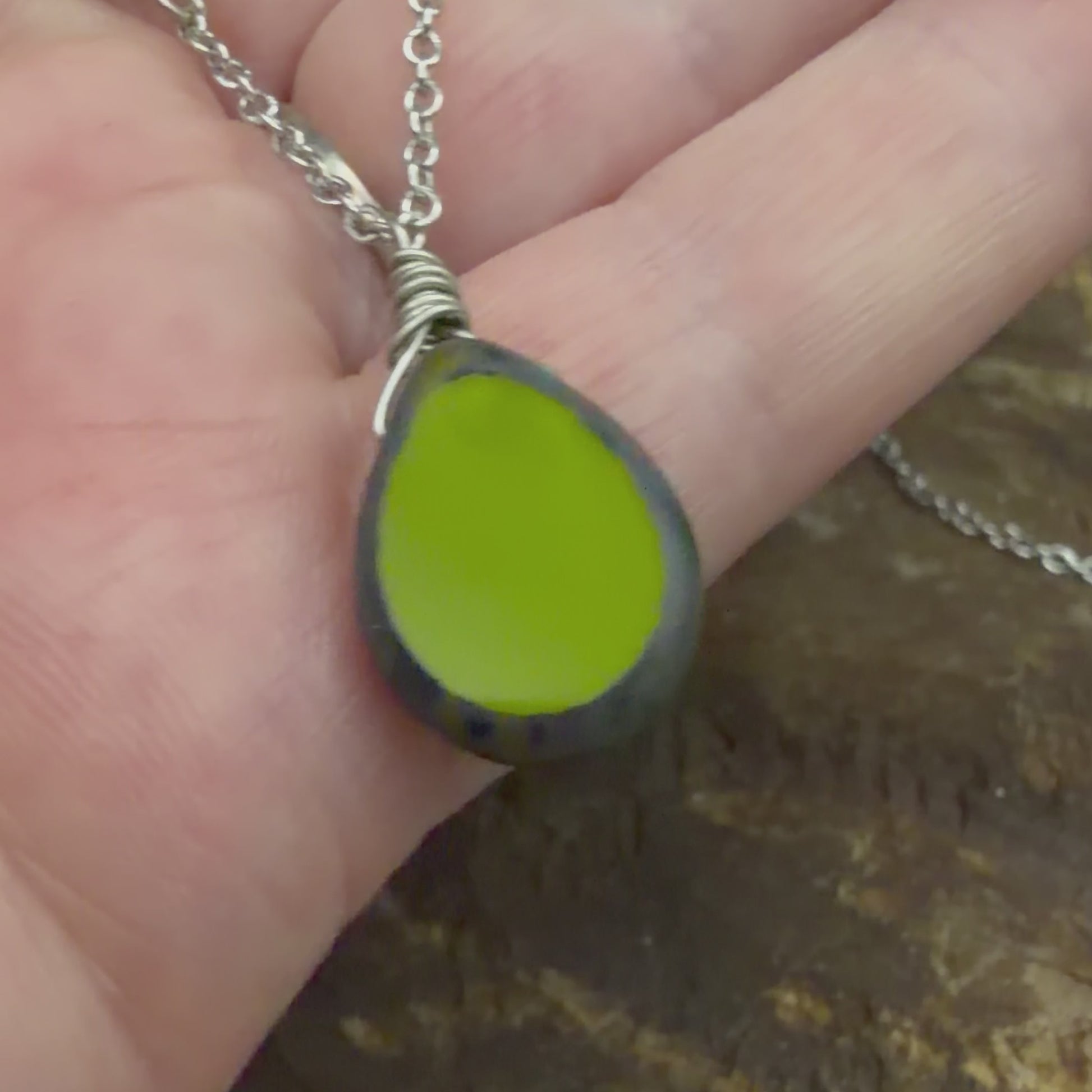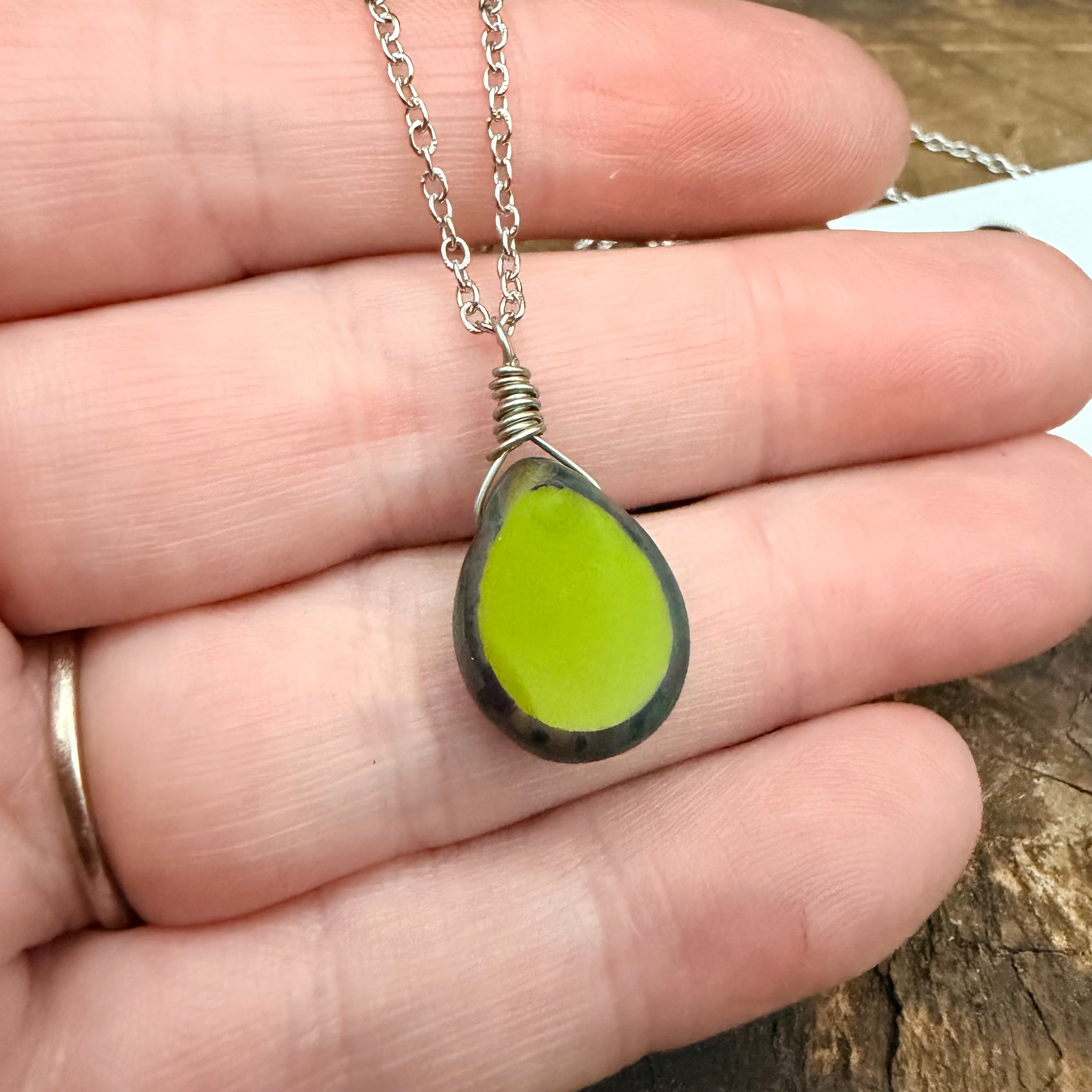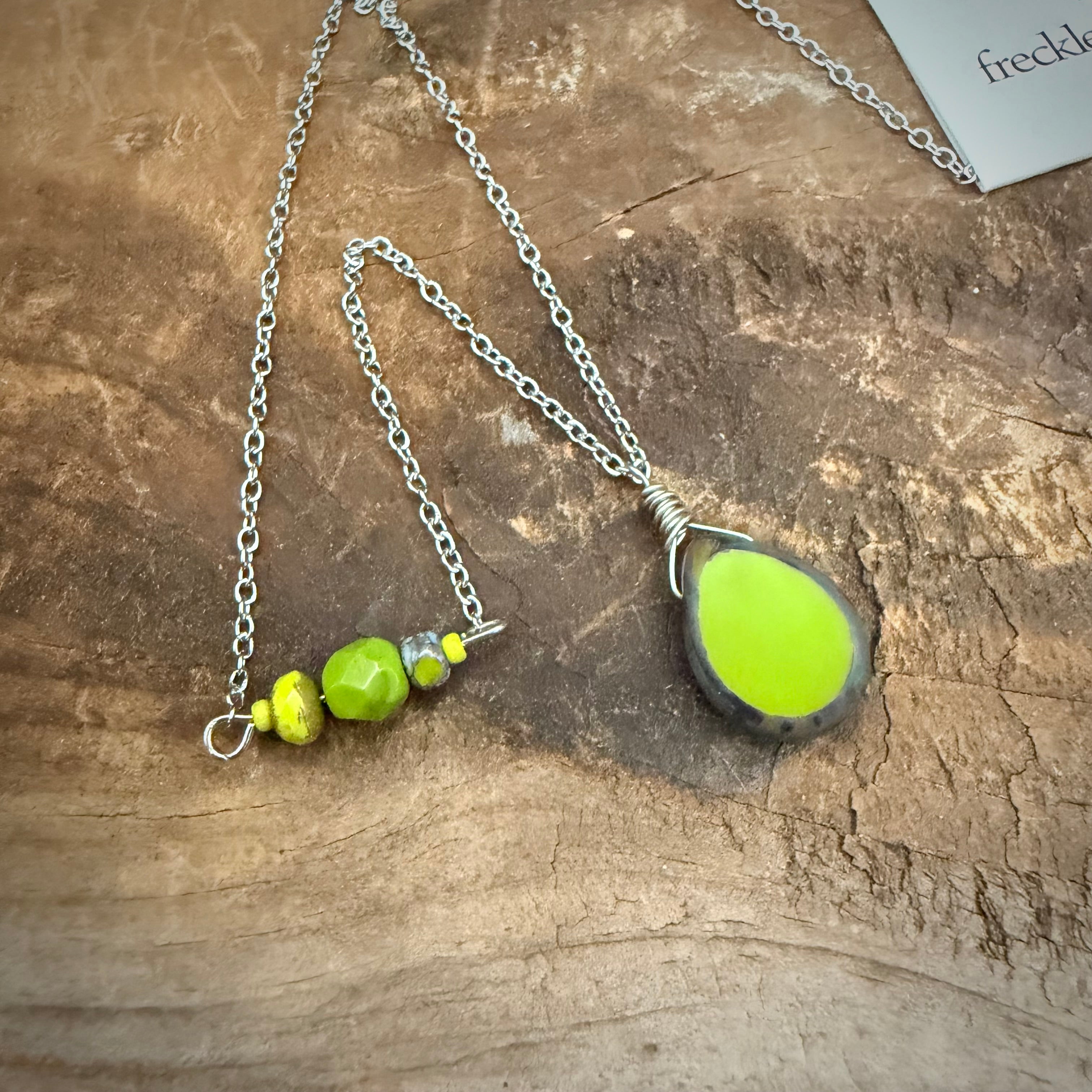 Bright, earthy, and full of life, the Chartreuse Glow Necklace features a hand-wrapped teardrop stone pendant in a vibrant chartreuse hue. The stone is wrapped in smooth stainless steel wire and paired with a coordinating strand of Czech glass beads, creating a balanced mix of bold colour and natural texture.