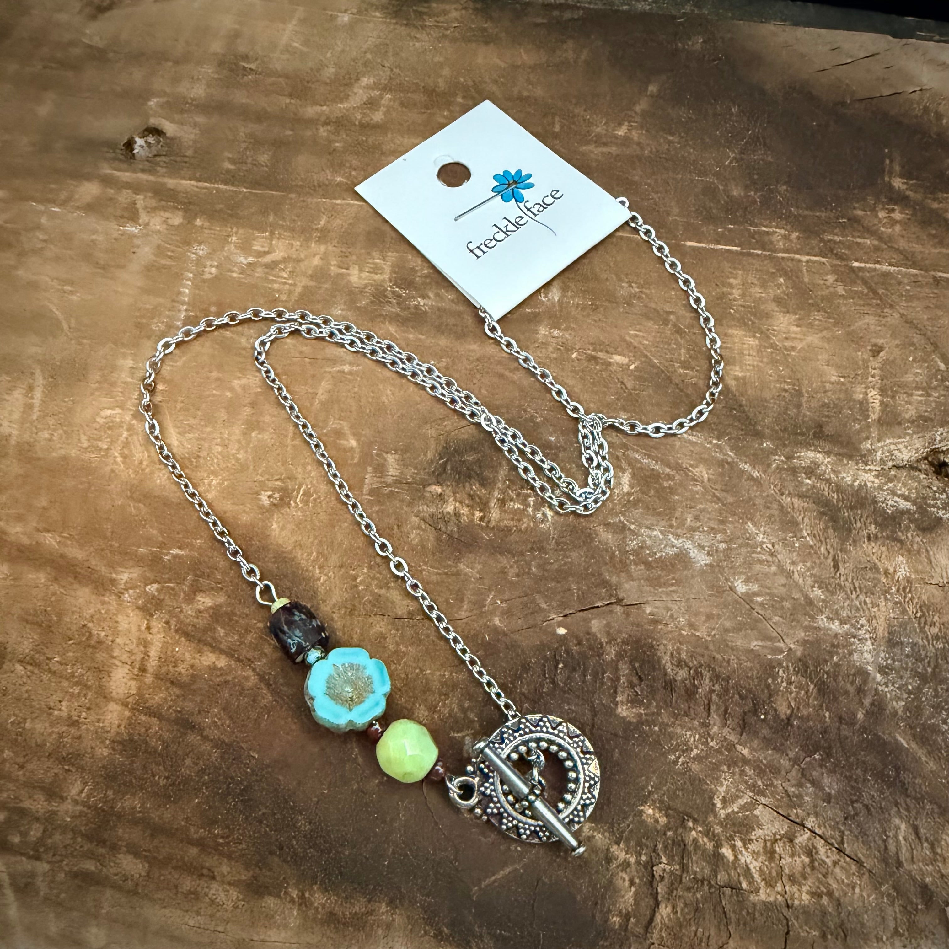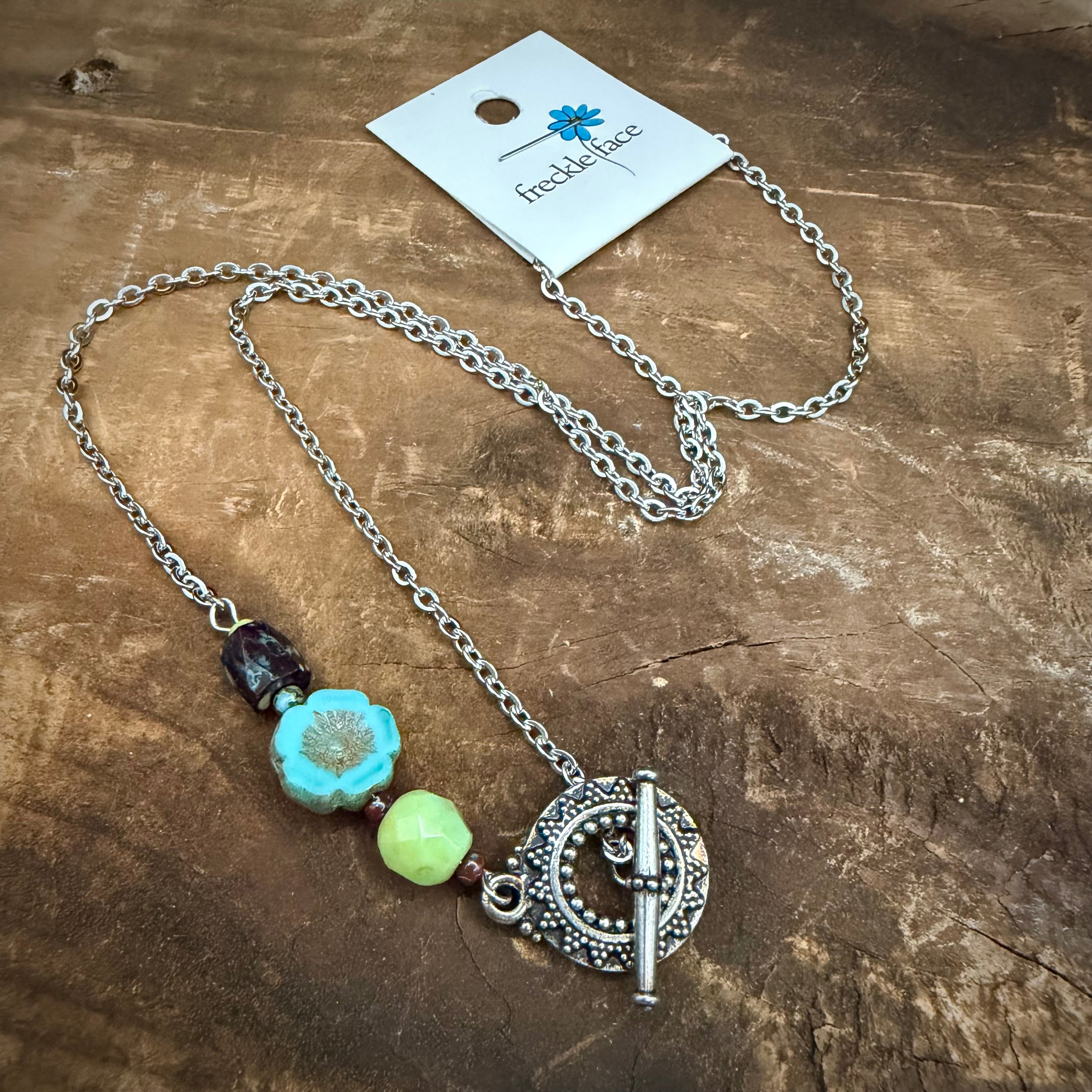 This handcrafted necklace features a playful mix of Czech glass beads in fresh, nature-inspired colours, finished with a decorative circular toggle clasp that becomes part of the design.