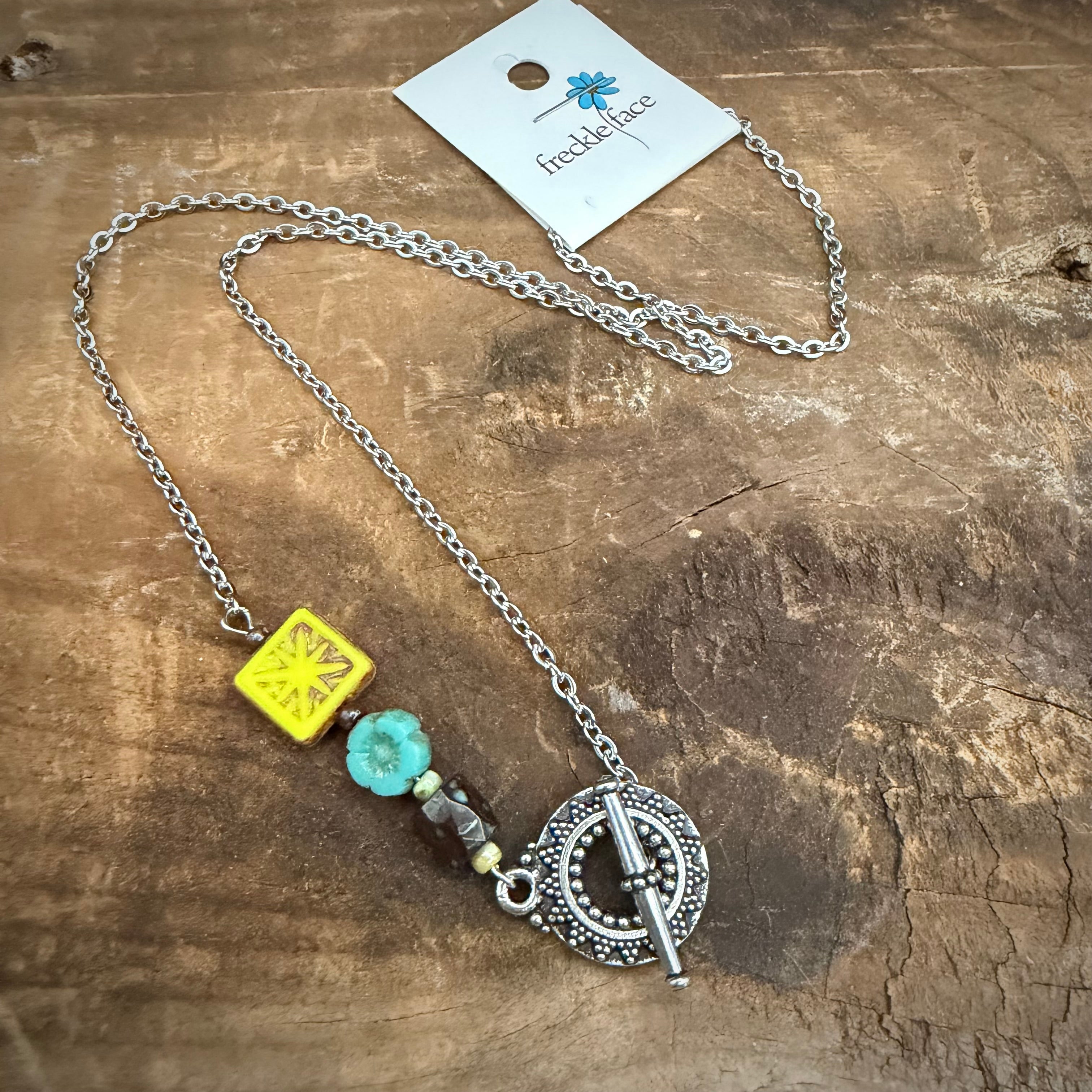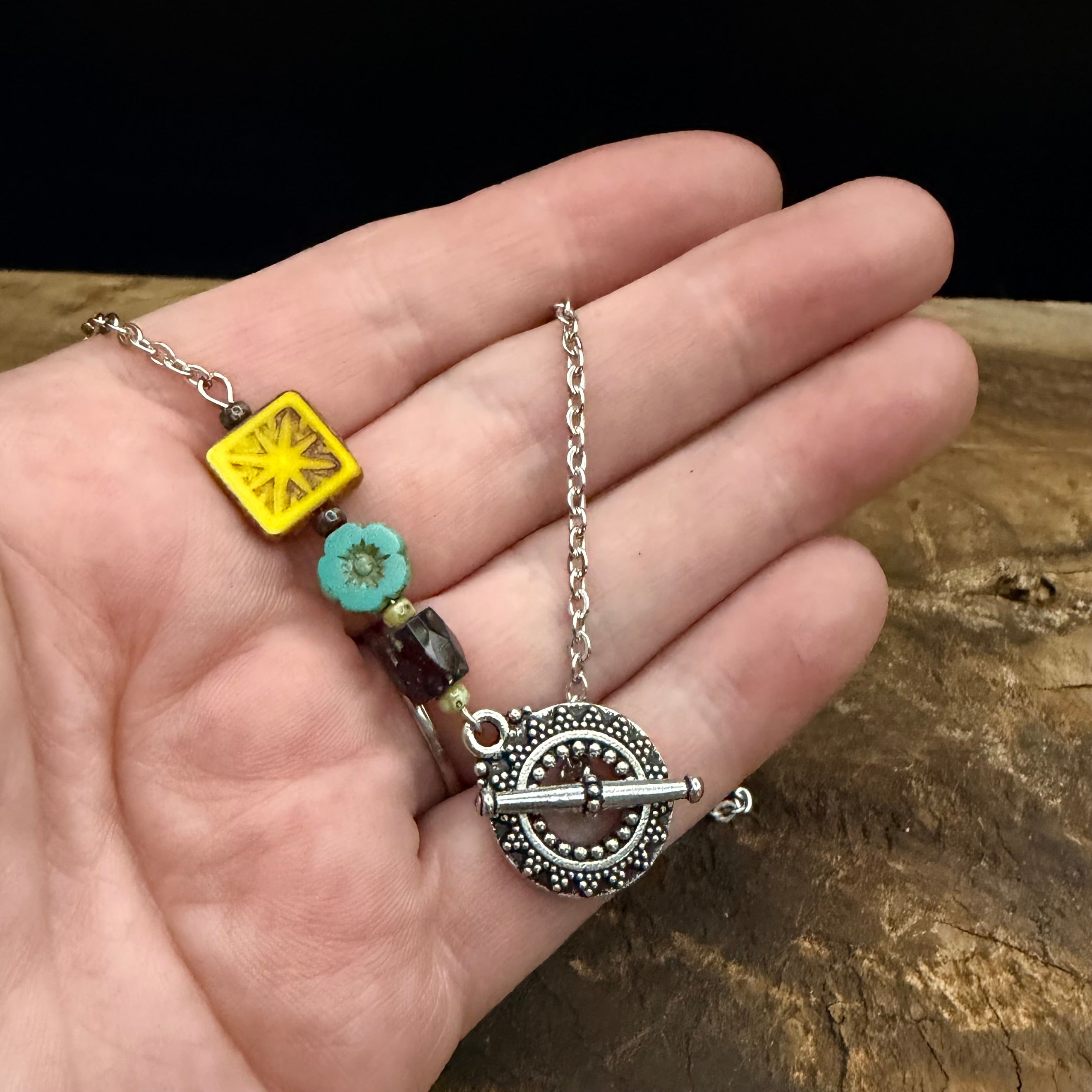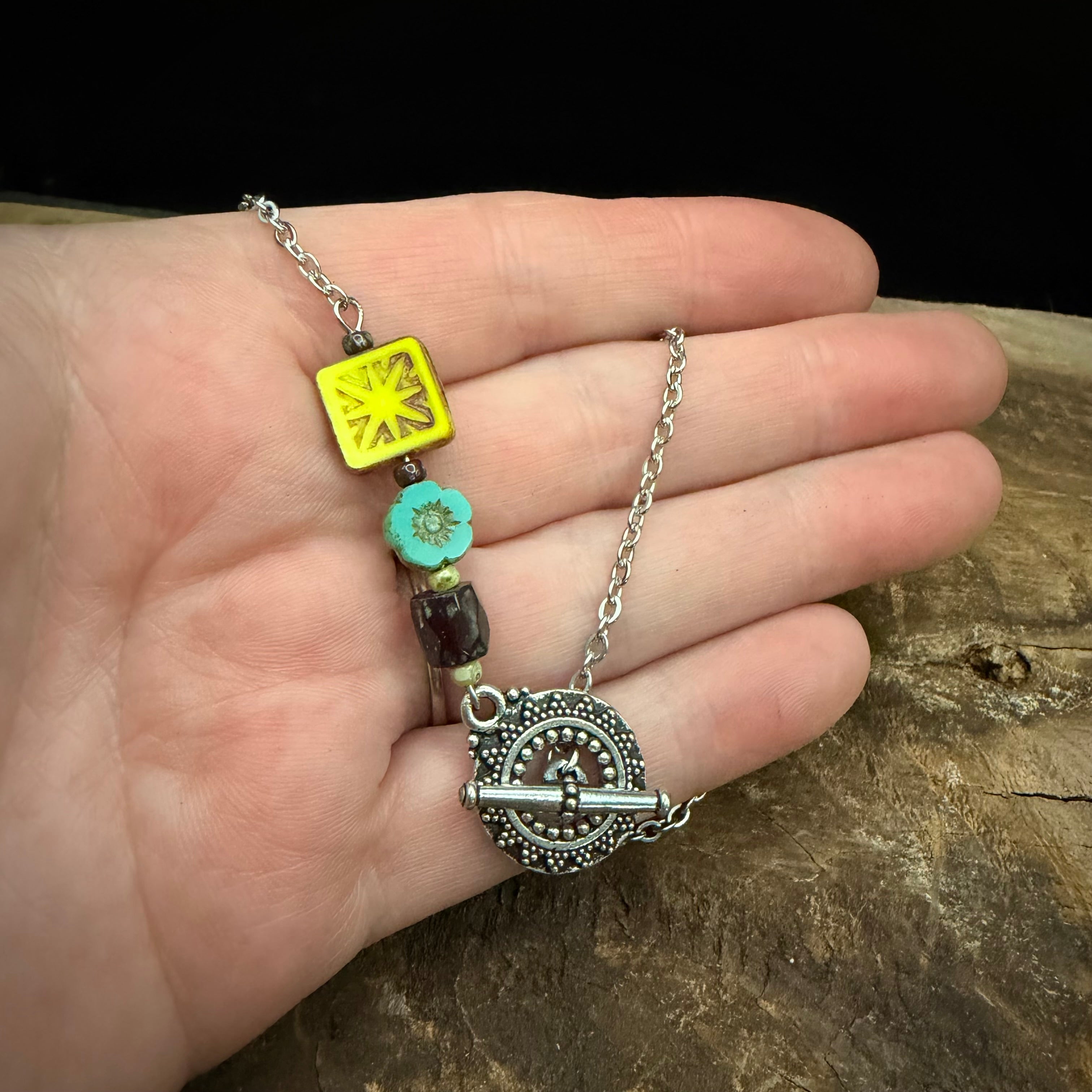 This handmade beaded necklace features a unique mix of Czech glass beads in complementary shapes and tones, finished with a decorative toggle clasp. Each bead is carefully selected and assembled by hand, creating a one-of-a-kind piece with its own character and charm.