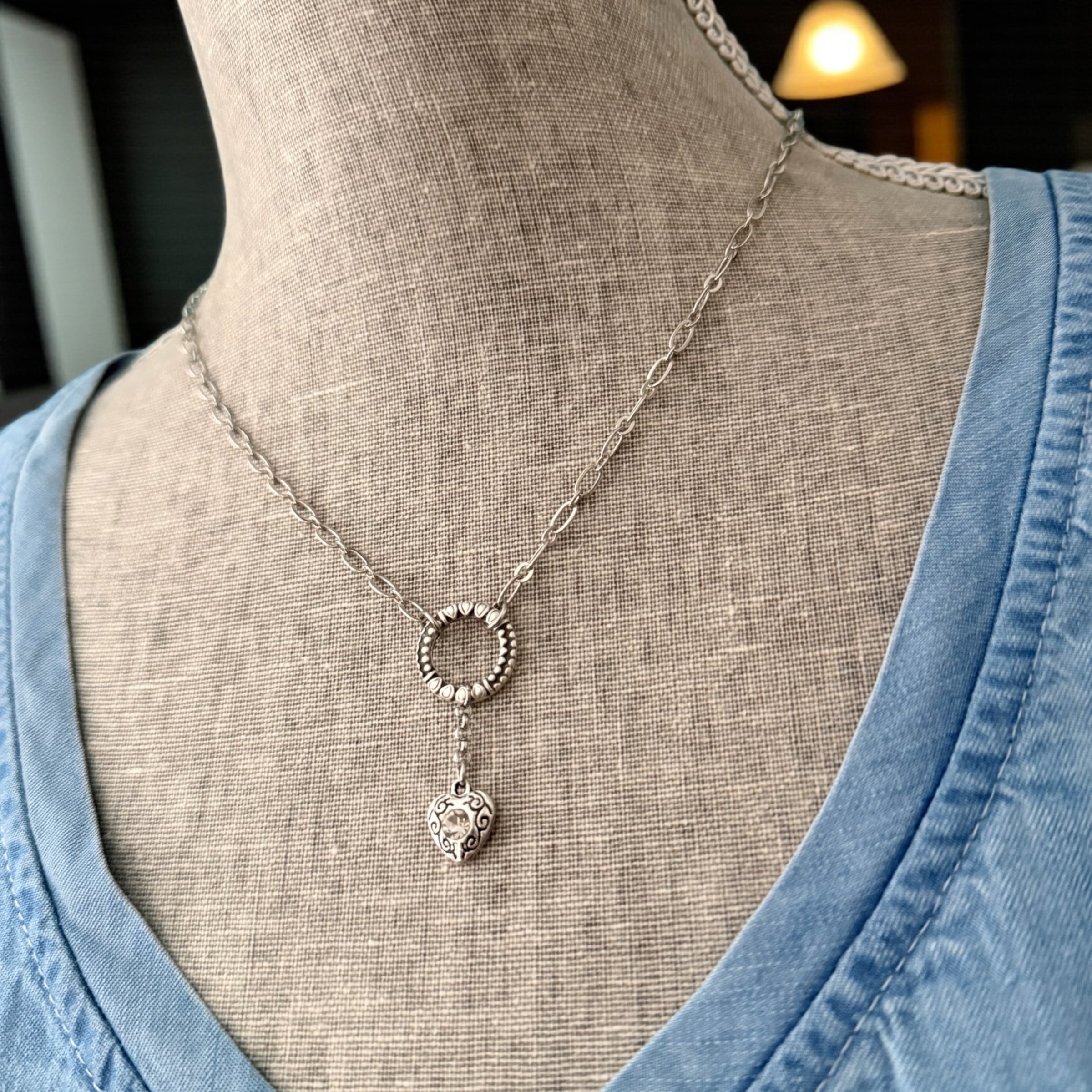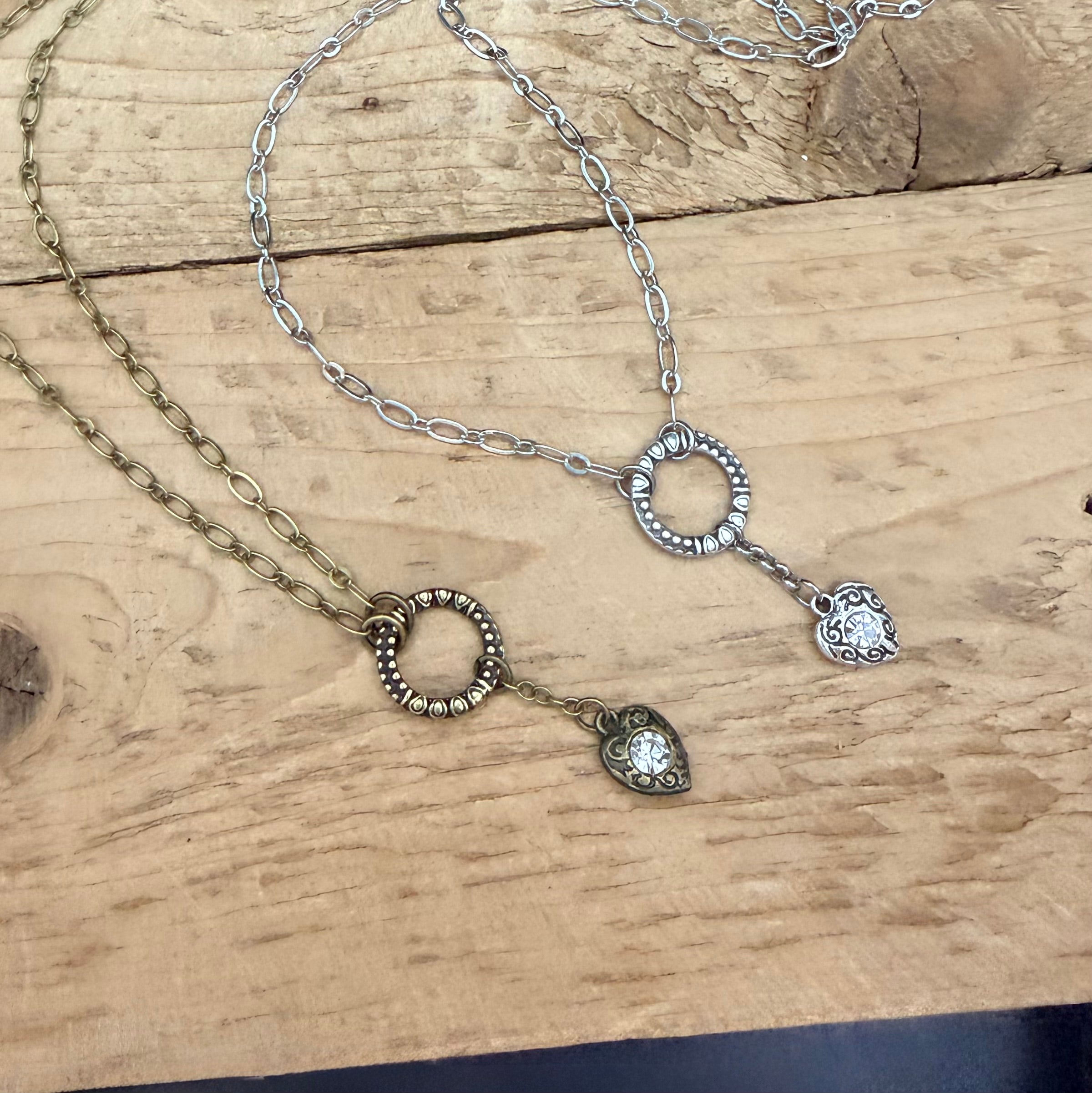 The Heartstring Necklace features a softly textured circular link symbolizing continuity and balance, finished with a graceful heart charm that hangs gently below. Thoughtfully designed with vintage-inspired details, this piece feels both timeless and meaningful — like something you’ve always had, or were meant to find.