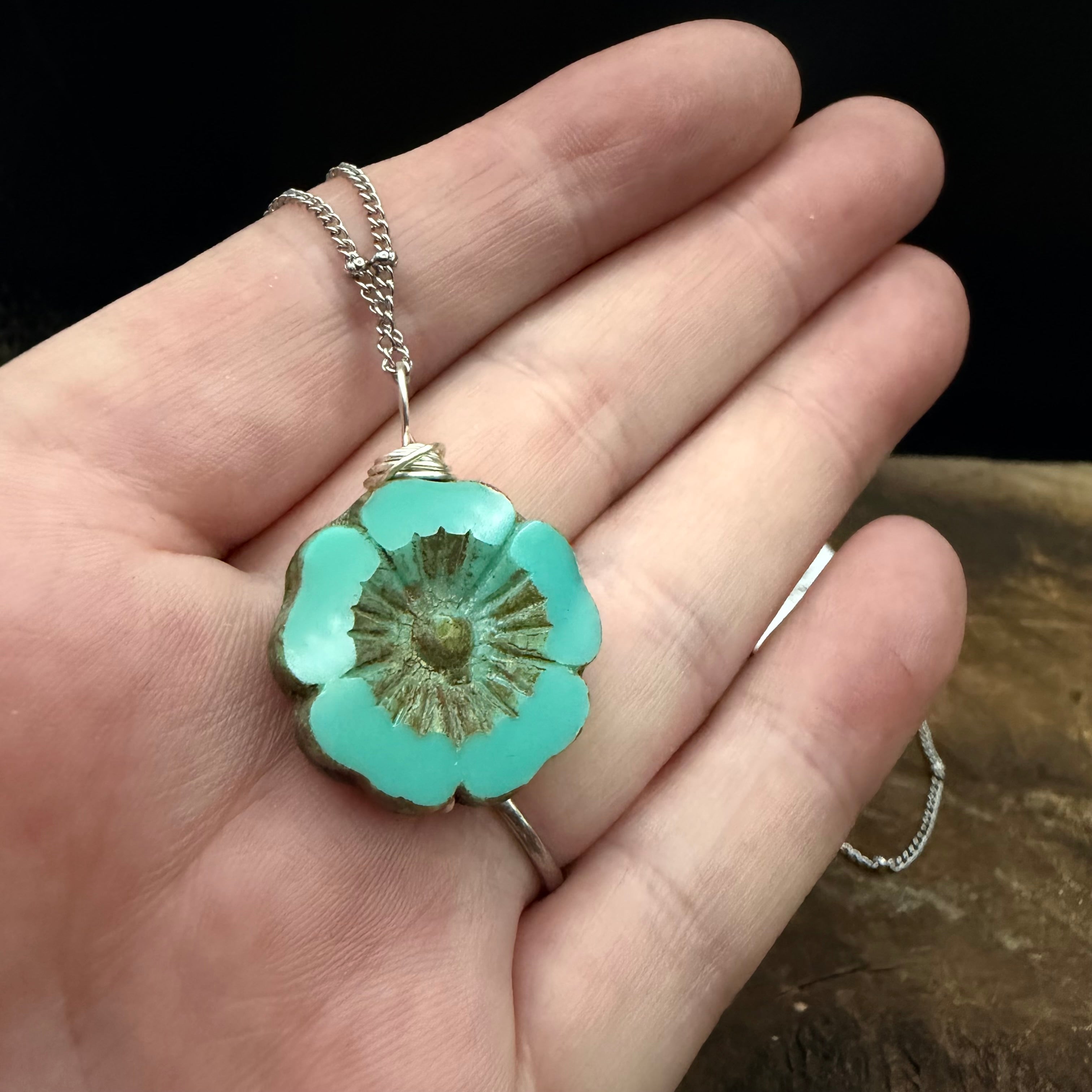 This handcrafted necklace features a unique Czech glass flower shaped pendant, wrapped by hand in smooth stainless steel wire and finished with a delicate wire detail. Each stone has its own natural variations in colour and pattern, making every necklace truly one of a kind.