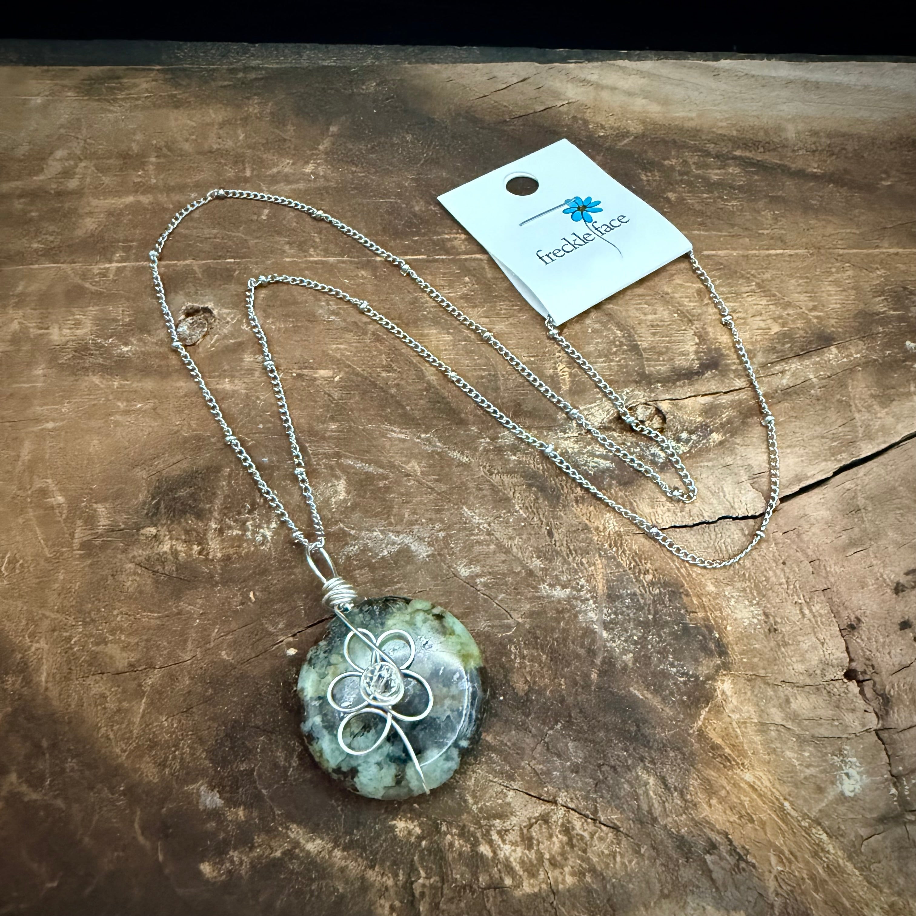 This handcrafted necklace features a unique stone pendant, wrapped by hand in smooth stainless steel wire and finished with a delicate wire flower detail accented by a clear crystal centre. Each stone has its own natural variations in colour and pattern, making every necklace truly one of a kind.