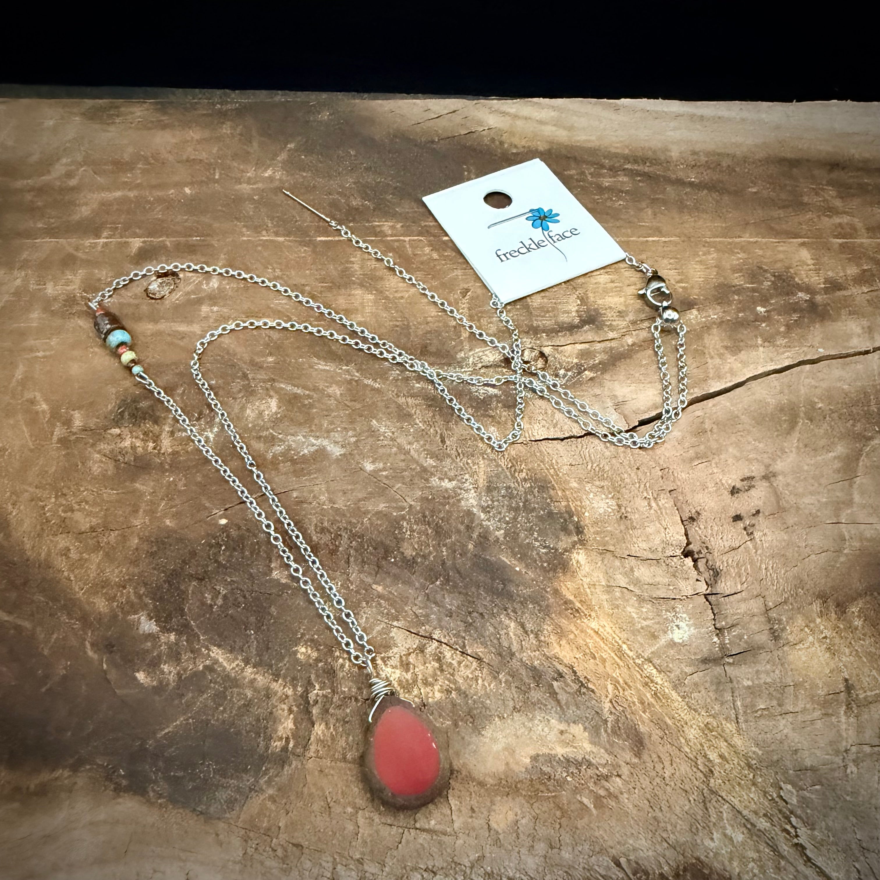 The Ember Glow Necklace features a glowing red teardrop pendant, wire wrapped by hand and paired with a strand of carefully chosen accent beads along the chain. The warm ember-like centre adds depth and richness, while the subtle texture around the edge gives it an earthy, organic feel.