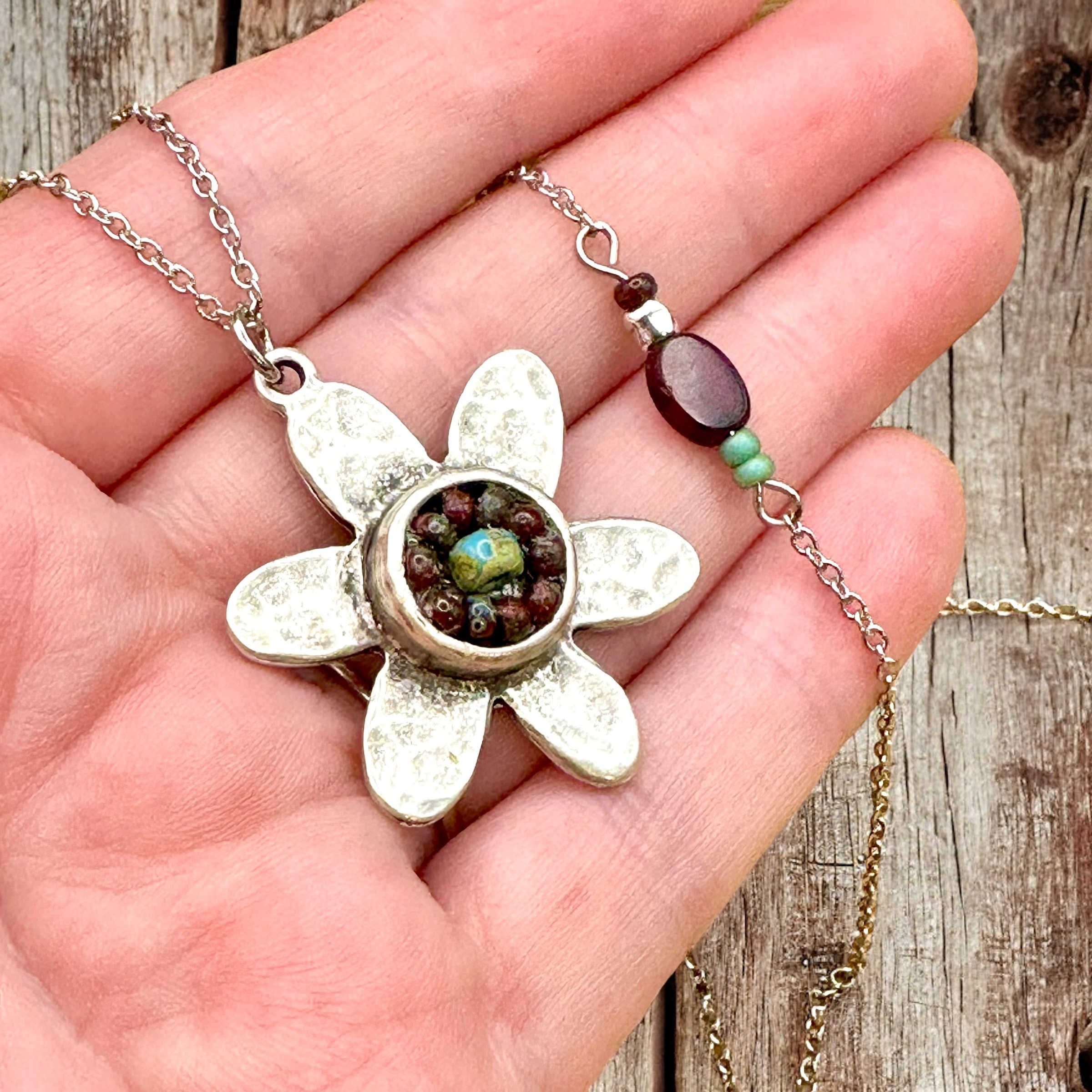 This handcrafted necklace features vibrant mosaic accents, each bead placed with love to create a one-of-a-kind piece. I had so much fun making these! The adjustable 22" stainless steel chain allows you to wear it at the length you prefer, and I've added a matching bead set into the chain for an extra touch of charm. The silver flower pendant, measuring approximately 30mm, is removable—perfect for adding your favorite mix-and-match charms (check out the link) or charms from the Charm Bar. At Freckle Face, we love giving you OPTIONS! This necklace is hypoallergenic, versatile, and full of personality. I hope you love it!