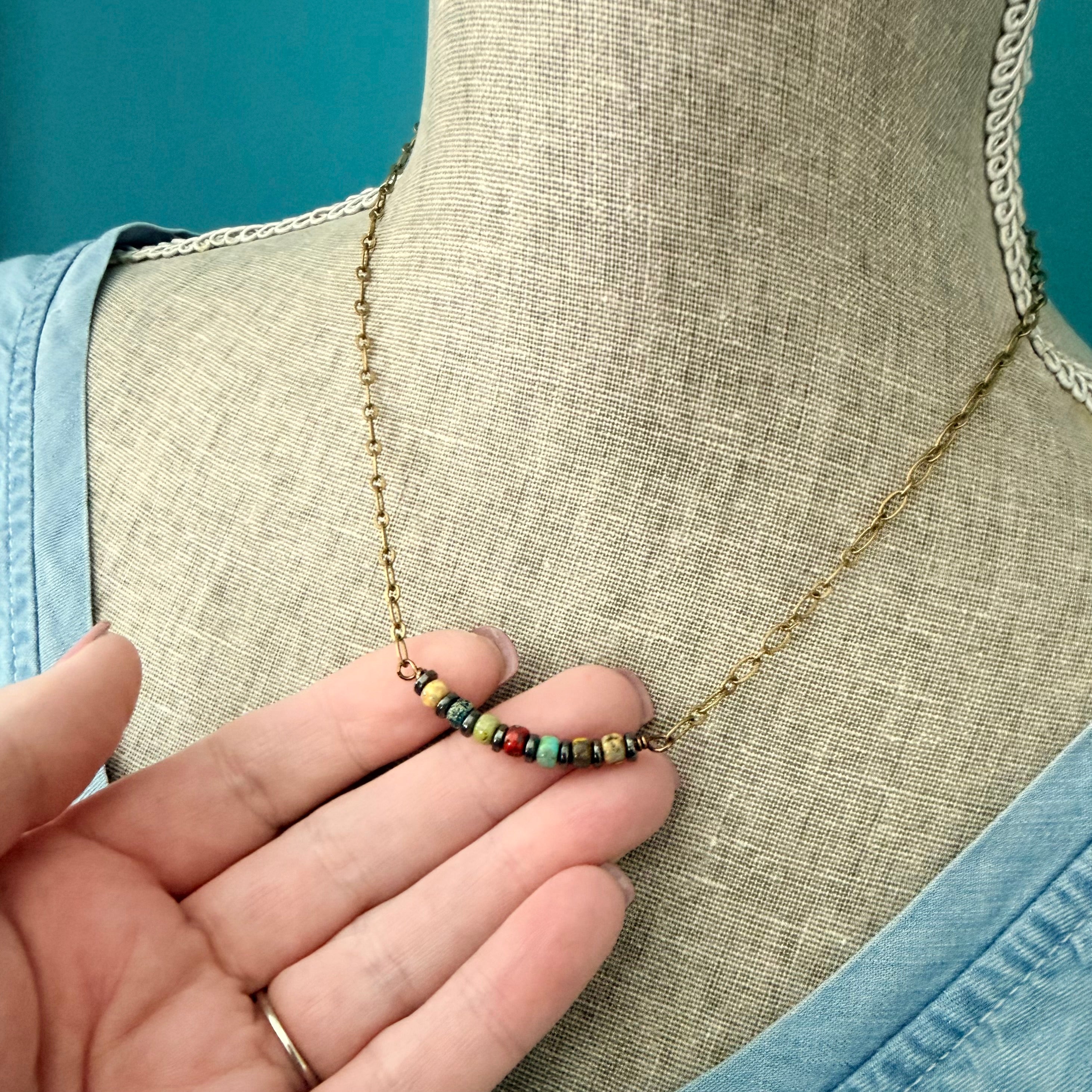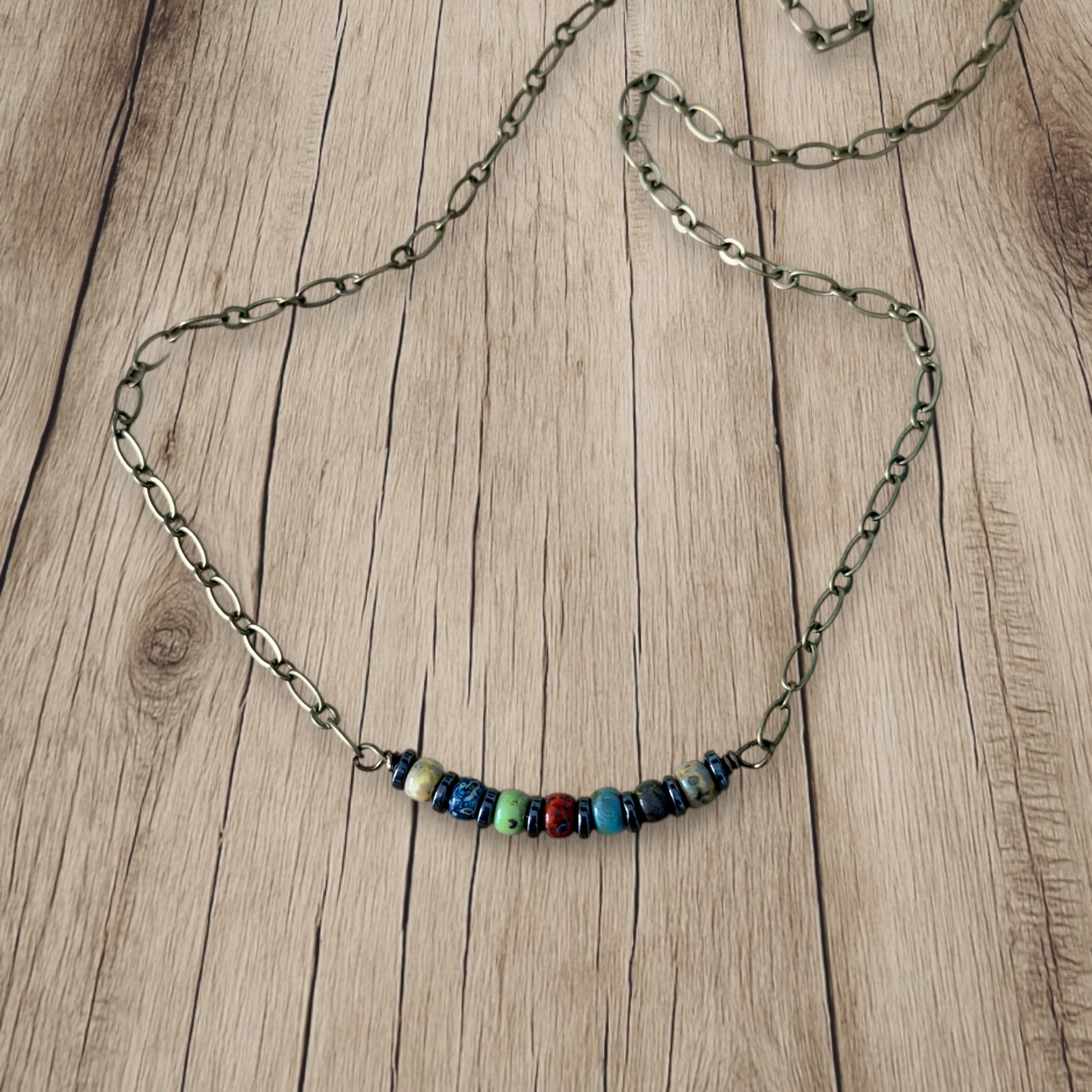 The Happy Little Beads Necklace features a cheerful row of earthy, mixed-tone beads centered on a warm antique brass chain. Each bead is slightly different, creating a playful, organic look that feels easy, comforting, and full of personality.