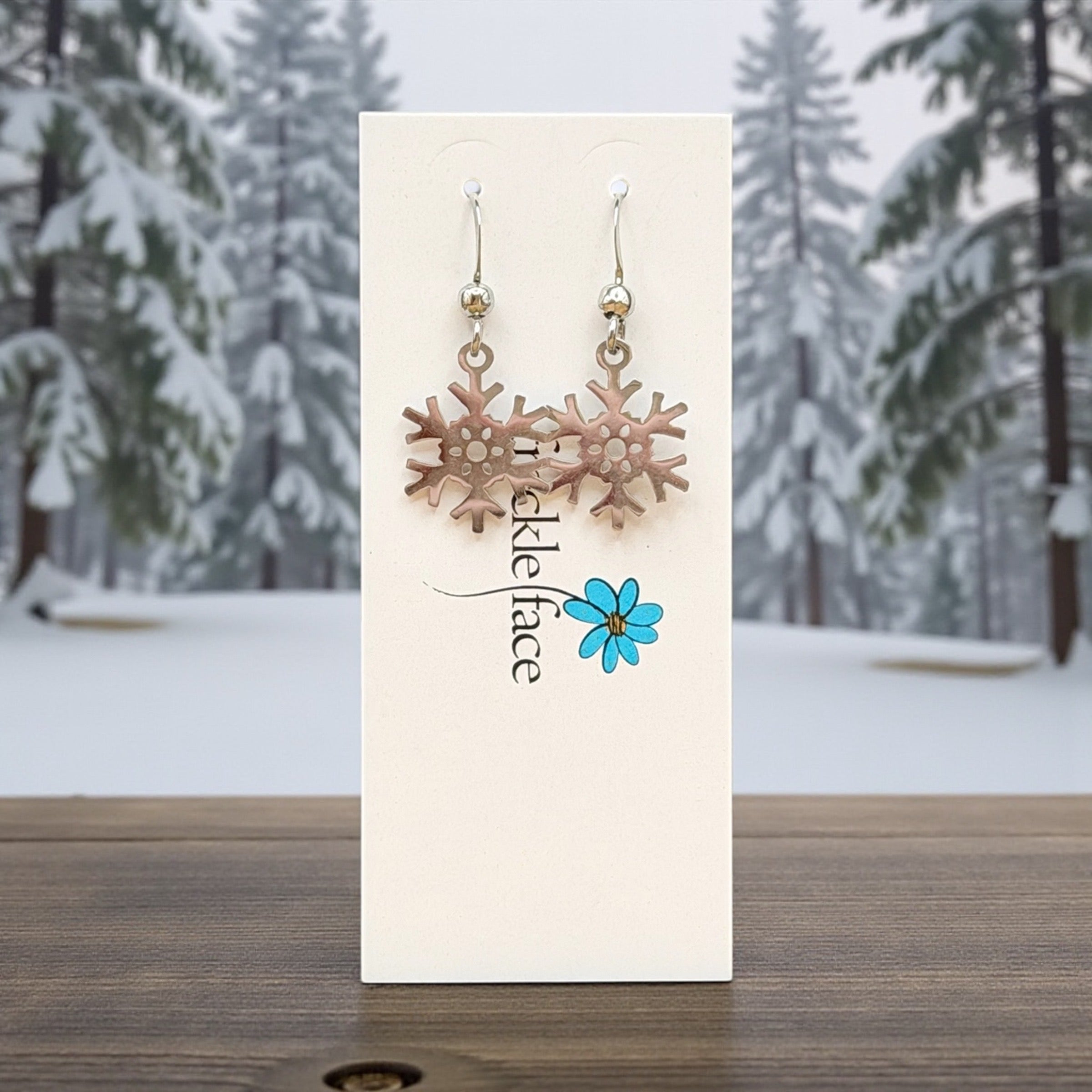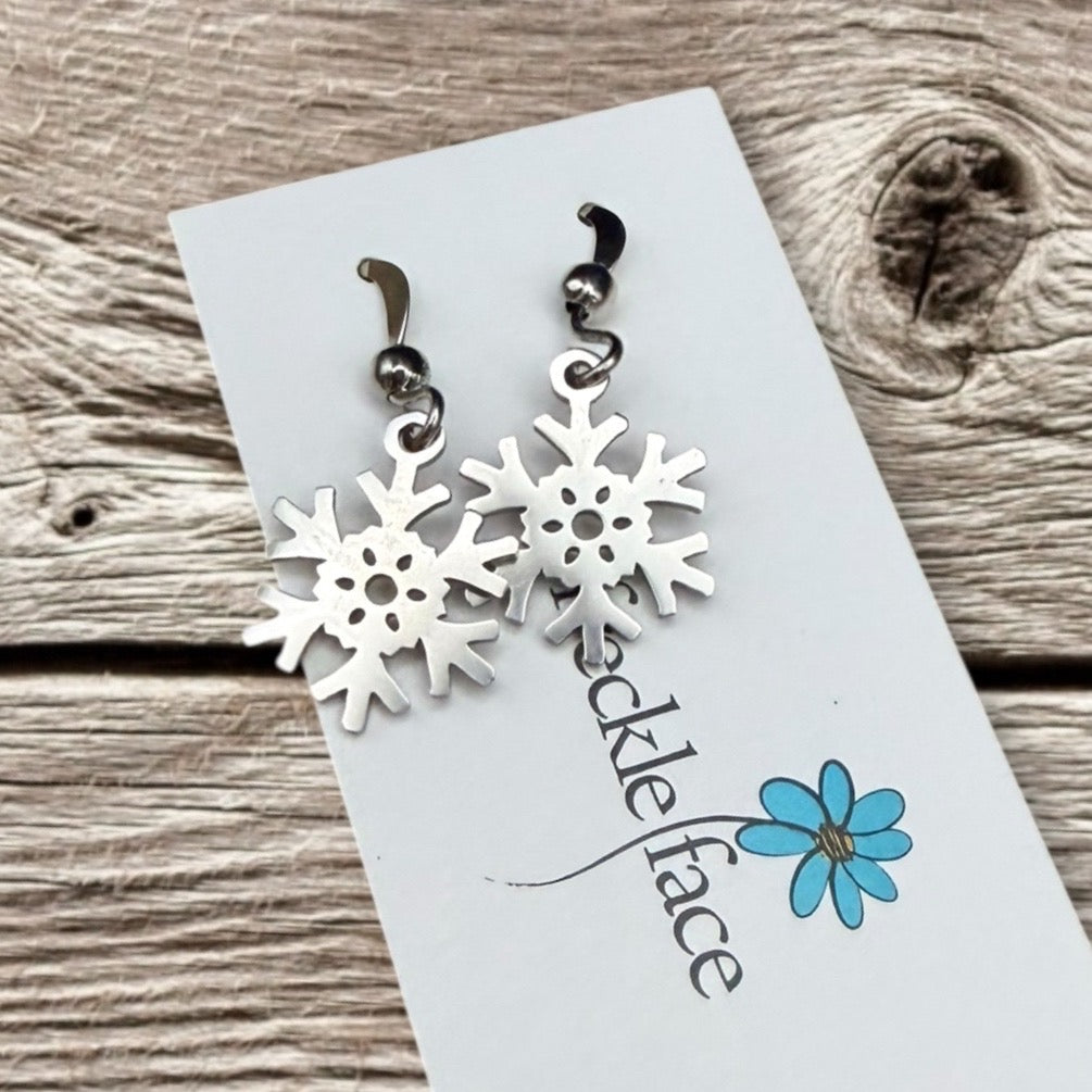 These earrings are great for sensitive ears. They are super lightweight and the snowflakes are  stainless steel.  Each snowflake is approximately 12mm.   I hope you love them!!